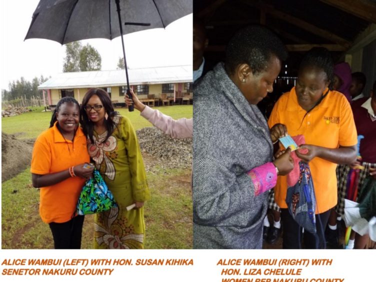 Alice boldly approached many top political leaders to describe her work as a DfG leader. She even pushed local community leaders to include menstrual health education in schools: “I challenged leaders to come into partnership with Days for Girls and through this I was able to convince them to mentor both boys and girls, men and women on menstrual hygiene related issues.” Alice now routinely provides education to boys and girls alike and often travels over ten hours to reach some of the most rural communities in Kenya. She has also worked directly with the Honorable Susan Kihika of Nakuru County as well as Senator and the Honorable Liza Chelule the Women’s Representative for Nakuru County.
